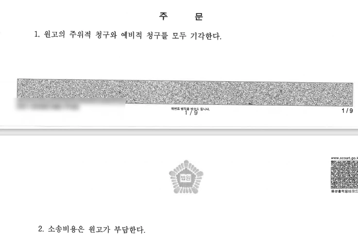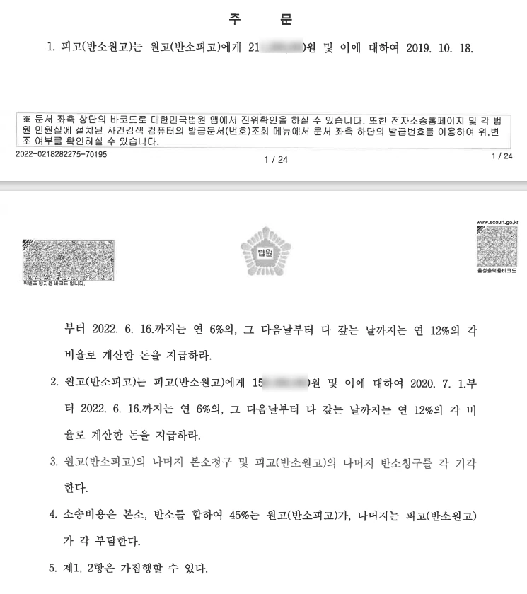 판결문을 송달받으면 우선 "주문" 판결의 결론부터 보아야 한다. 왼쪽 판결문은 원고가 패소한 경우 기각판결이고, 오른쪽 판결문은 원고와 피고가 각자 소송을 제기하여 본소와 반소가 된 부분인데, 각자 일부승소, 일부패소의 판결이다. 승소의 경우, 소장에서 적은 청구취지에 따라 "지급하라", "인도하라" 등의 판결이 난다.
