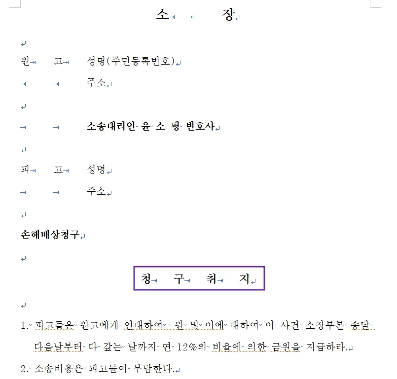 소장은 원고, 피고의 인적 사항 등에 대해 기재하고, 청구내용을 형식에 맞게 청구취지라는 항목에 기재하고, 자신의 주장을 뒷받침하는 주장, 사실 등을 청구원인에 자세하게 기술한다.