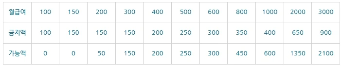 * 월급여액 / 금지액은 가압류(압류)금지액 / 가능액은 가압류(압류)허용액 / 단위 (원)