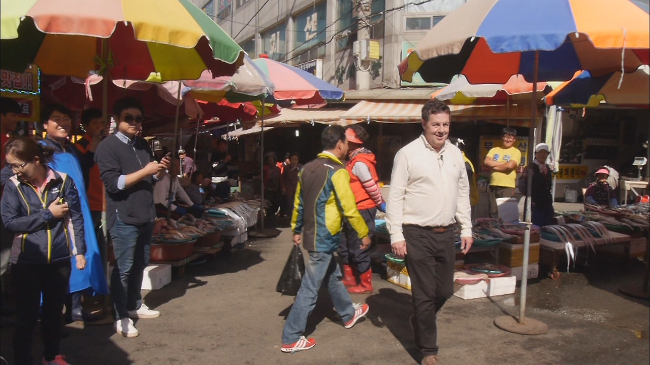 방송인 로버트 할리씨가 기장시장에 가서 기장 먹거리를 체험하고 있다.기장시장. 해산물을 비롯해 기장산 농수산물이 한 자리에 다 모인다는 곳이 이 곳이다.