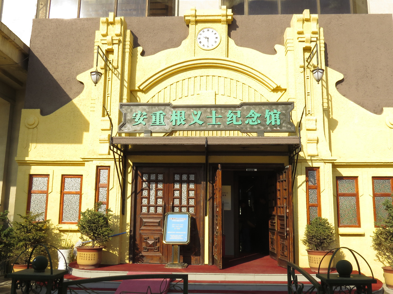 중국 하얼빈역에 있는 안중근 기념관에 있는 안의사 관련 자료. 윗줄 좌측부터 시계방향으로 안 의사의 초상화와 기념관을 중문과 한국어로 설명하고 있는 소개문. 안 의사의 저술에 대한 소개문. 동양평화론 저술 당시의 기록화. 안의사의 흉상