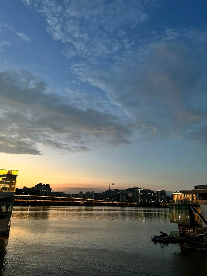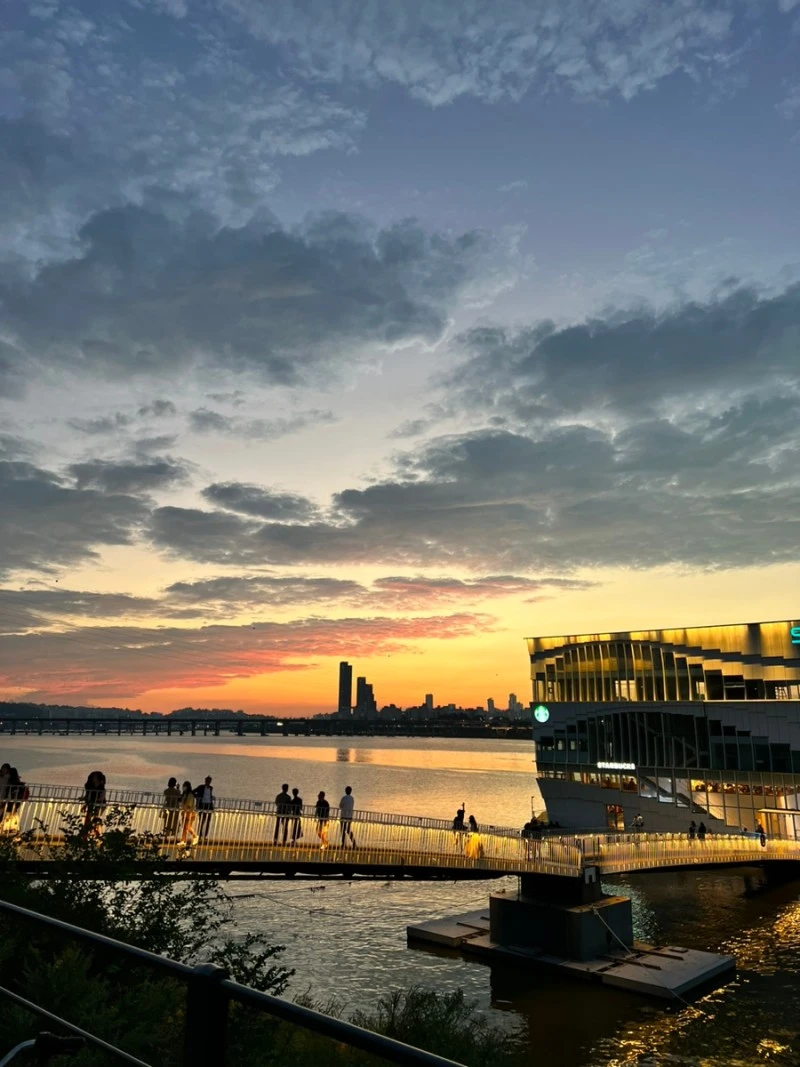 무슨 행사를 하는지 반포대교 주변은 사람들로 인산인해, 곳곳에서 공연하는 소리에 가판에서 파는 음식 냄새까지 더해져서, 아마 친구가 부르지 않았다면 나는 이 더운 날씨에 한강에 가지 않았을 거다. 그때였다. 답답한 마음에 눈을 들어보니 저 멀리 강 건너편에서 해가 지고 있었다.
