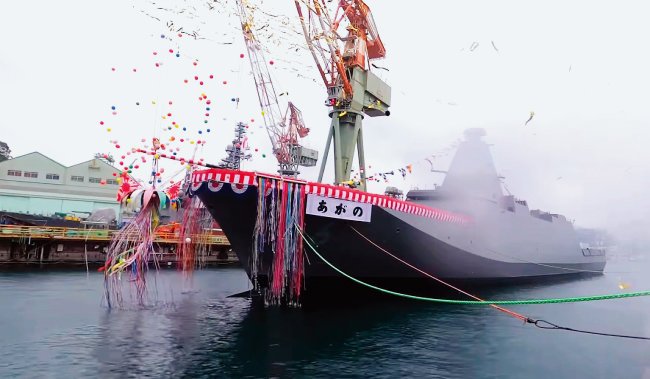 (사진) 지난해 12월 21일 일본 나가사키조선소에서 해상자위대 모가미급 호위함 아가노(あがの)가 진수됐다. [일본 해상자위대 트위터 캡처]
