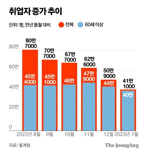 1월 취업자 수가 지난해 같은 달보다 41만1000명 늘었는데, 대부분(97.3%)가 60세 이상 고령층이라고 한다. 40대와 20대 취업자는 많이 감소해 고용의 양뿐 아니라 질도 하락했다는 것이다.