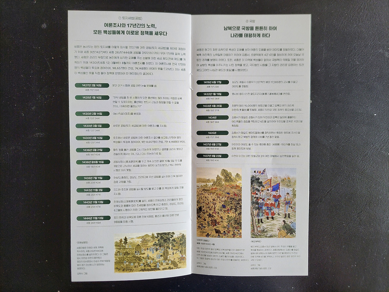 세종은 32년간 임금자리에 있으면서 백성 중심의 각종 정책을 펼쳤다. 이걸 문자, 인쇄·출판, 역사, 음악, 교육, 의료·복지, 토지세, 국방, 농업, 과학의 10개로 나눌 수 있다. 이중 문자와 국방에 대한 부분이다.