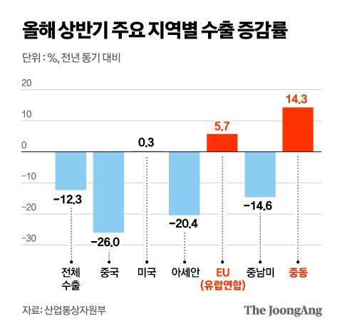 그나마 상반기 수출이 더 떨어지지 않게 버텨준 데엔 EU·중동 시장의 역할이 컸다. 최대 시장인 중국으로의 수출은 1년 전보다 26% 급감했고, 아세안(-20.4%)과 중남미(-14.6%) 등도 줄줄이 하락했다. 미국 수출도 0.3% 증가로 보합세에 가까웠다.