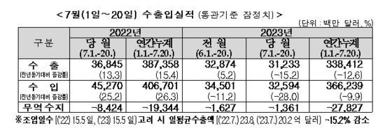 7월 1~20일 수출입 전년 동기보다↓…무역적자 14억달러(종합)