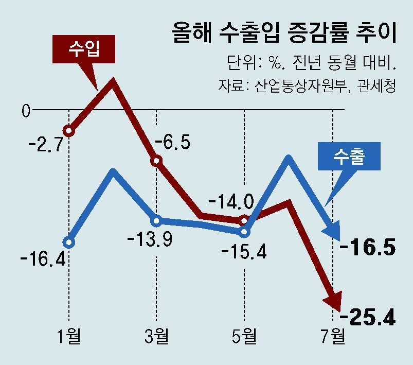 반면 수출액은 503억3000만 달러로 전년보다 16.5% 줄었다. 6월(―6.0%) 한 자릿수로 줄었던 수출 감소 폭은 다시 두 자릿수로 확대됐다. 한국의 최대 수출 품목인 반도체 수출이 12개월 연속 줄었다. 반도체 수출액은 74억4000만 달러로 전년보다 약 38억 달러(33.6%) 감소했다. 전체 수출 감소분(―99억 달러)의 39%다.