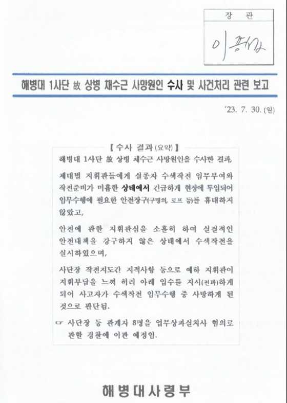7월 30일 오후 4시 이종섭 국방부 장관은 박정훈 대령으로부터 이같은 내용을 직접 대면 보고를 받은 것으로 확인됐습니다. 보고 당시 배석한 참모진에게 과실치사 혐의 적용에 대한 의견을 물었고, "국민 눈높이에 맞는 조사 결과인 것 같다"는 대답을 들은 것으로 전해졌습니다. 그리고선 보고서에 직접 서명을 했습니다. 조사 결과에 이상이 없고 예정된 날짜에 경찰로 자료를 보내라는 승인을 한 것입니다.