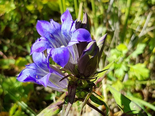 (용담. 꽃잎이 펼쳐지며 진한 보라색으로 피는 꽃이다. 뿌리를 약으로 쓴다.)