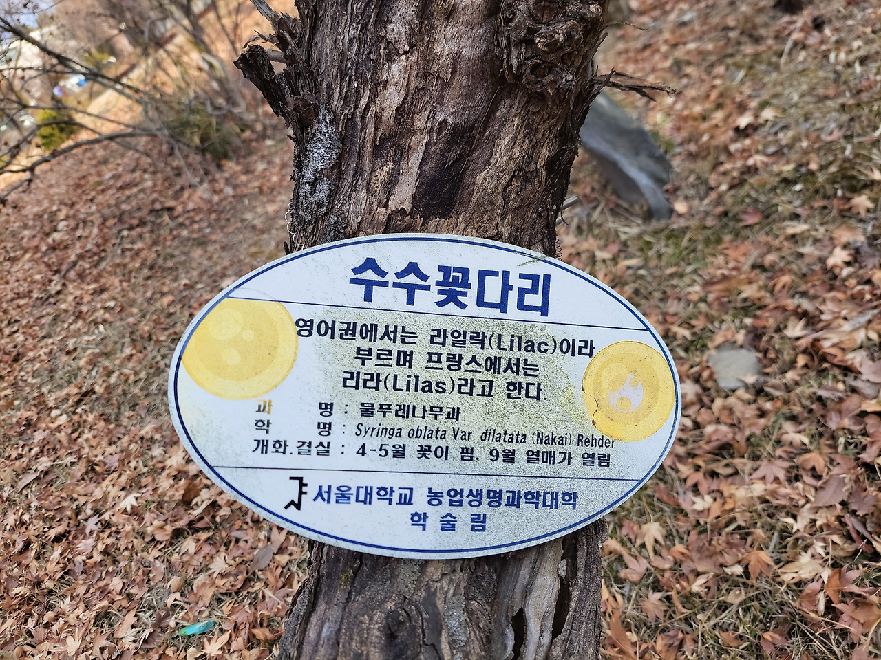 수요일(20240214) 사당역에서 관악산 둘레길을 걷다가 서울대학교 캠퍼스 안으로 실종되었습니다 어디더라 낯익은 곳에 갔더랬습니다 지나치는 여학생 점퍼에 ‘SNU college of fine art’라고 붙어 있습니다 ‘fine art’가 뭐더라 생각하다가 어떤 나무에 다가갔습니다 ‘수수꽃다리’ ‘수수-꽃-다리’