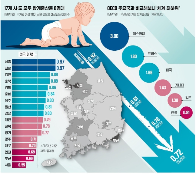 합계출산율 쇼크, 지난해 합계출산율 0.72명 '우울한 新기록' 출산율 0.65명…전쟁 중인 우크라와 비슷 4분기 사상 처음 0.6명대…저출산 속도 빨라져 18년간 380조 투입에도 올해 0.7명선 무너질 듯
