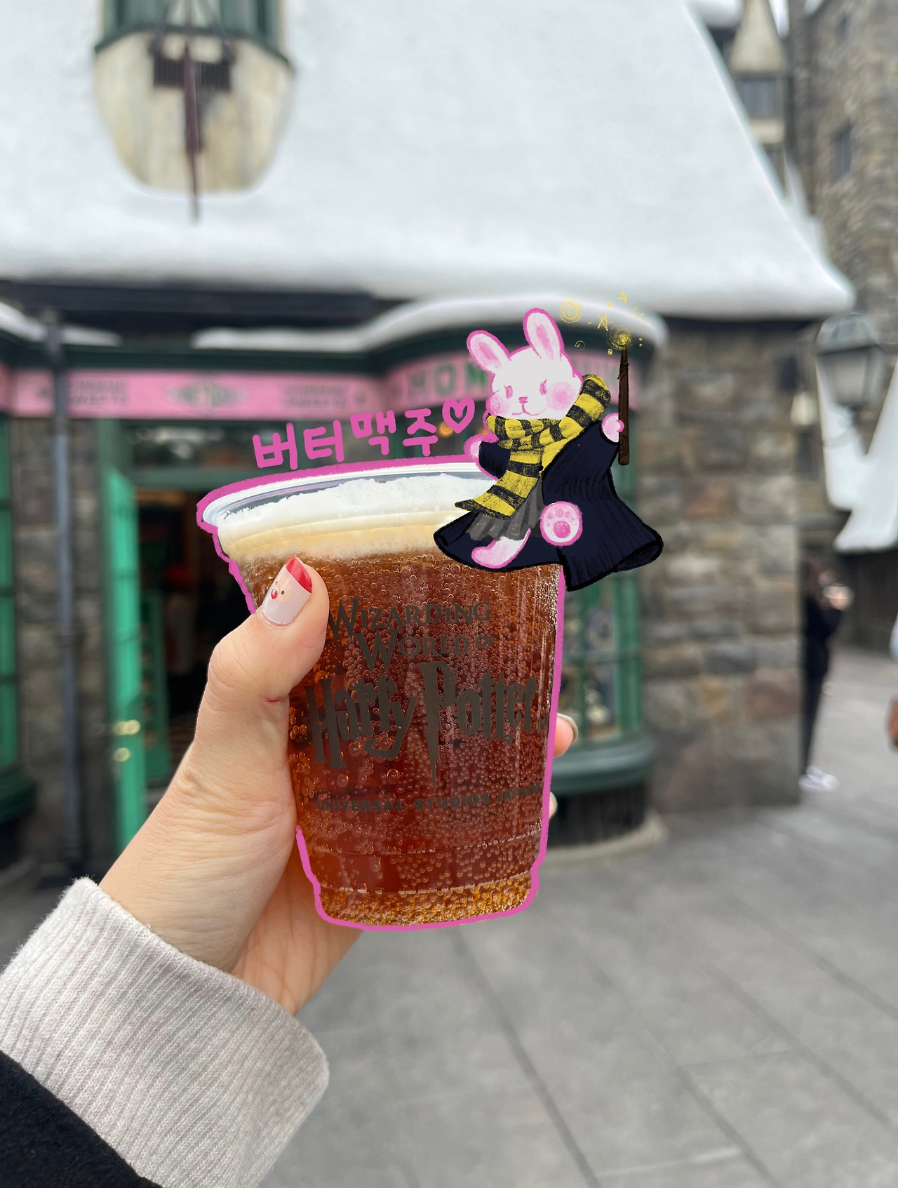 이번 일본 여행으로 오사카를 선택한 이유는 해리포터 덕후로서 유니버셜 스튜디오에 가기 위해서였다. 그리고 유니버셜 스튜디오를 다니며 먹었던 음식들에 대해 먼저 총평을 하자면 맛있다고는 차마 말하진 못하겠고 그렇다고 아주 못 먹을 맛도 아닌 맛들이였다. 가장 먼저 설레는 맘으로 구매한 버터맥주는 나는 먹기가 힘들었다. 갈색의 음료가 묘한 계피 맛의 탄산음료이고 위에 거품이 버터 맛을 내는 달달한 크림이다. 이 둘을 함께 먹어야 버터 맥주라고 부를 수 있는 맛이 나는데, 나는 도저히 먹기 힘들어서 남편이 절반 이상을 먹었다. 먹는 내내 차라리 블랑제리뵈르 버터 맥주를 가져와 파는 게 나을 것 같다는 생각을 계속했다. 두 번째로 먹은 음식은 죠스 놀이기구를 타고 먹은 무난한 감자튀김과 치킨, 해산물 수프이다. 무난한 맛 들이긴 했는데 입에 잘 들어가진 않았다. 세 번째로 먹은 것은 슈퍼 닌텐도 월드 파는 거북이 등껍질 모양의 빵이다. 빵은 호빵 같은 질감인데 안에 야끼소바처럼 내용물이 들어있다. 유니버셜 스튜디오에서 먹은 것 중 제일 맛있게 먹었던 것으로 기억한다. 마지막은 귀여운 미니언즈 모양의 빵이다. 안에 옥수수크림이 들어있던 것으로 기억하는데 무난하게 먹을 수 있는 맛이었다.