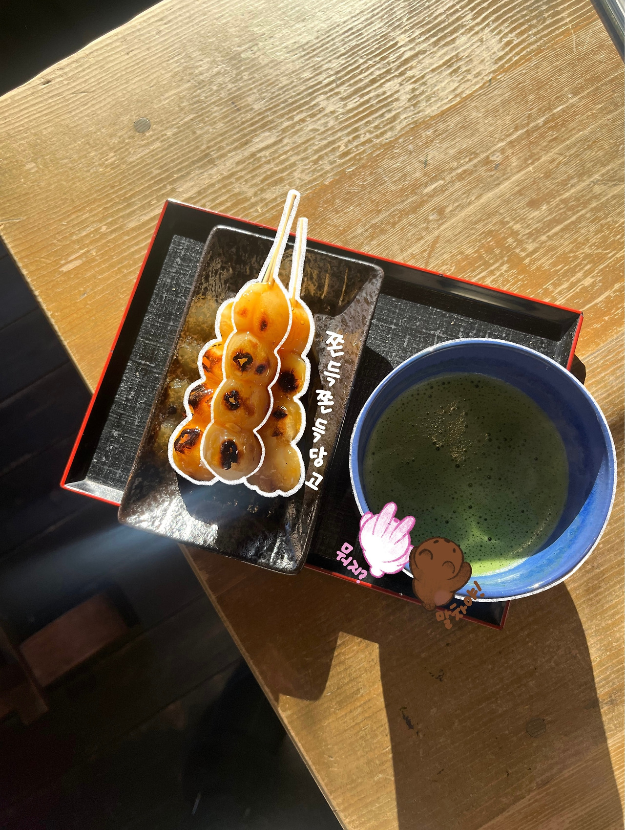 나는 무지외반증이 있어서 오래 걸으면 발가락이 너무 아파온다. 그래서 늘 이렇게 오래 걷는 중간중간에 카페에 앉아 발가락을 충분히 쉬게 하고 다시 걷고는 한다. 이 날도 숙소에서 청수사를 향해 가던 중 발이 너무 아파서 우연히 들린 장소였다. 일본 특유의 감성이 묻어나는 곳으로 굉장히 아기자기했다. 우리는 당고와 따뜻한 말차를 시켜 먹었는데, 고사리모찌와 말차 그리고 빙수가 유명한 곳이었다. 고사리모찌라는 이름이 생소해 찾아보니 물방울떡처럼 말랑거리는 떡에 인절미 같은 가루를 묻혀서 먹는 음식이라고 한다. 당고는 어린 시절 일본 애니메이션에서 종종 보던 음식이라 항상 먹어보고 싶었던 음식이다. 당고자체가 내 입맛에 잘 맞지는 않았지만 나쁘지 않게 잘 먹었다. 떡이 식은 후에도 여전히 말랑거리는 게 신기했다.
