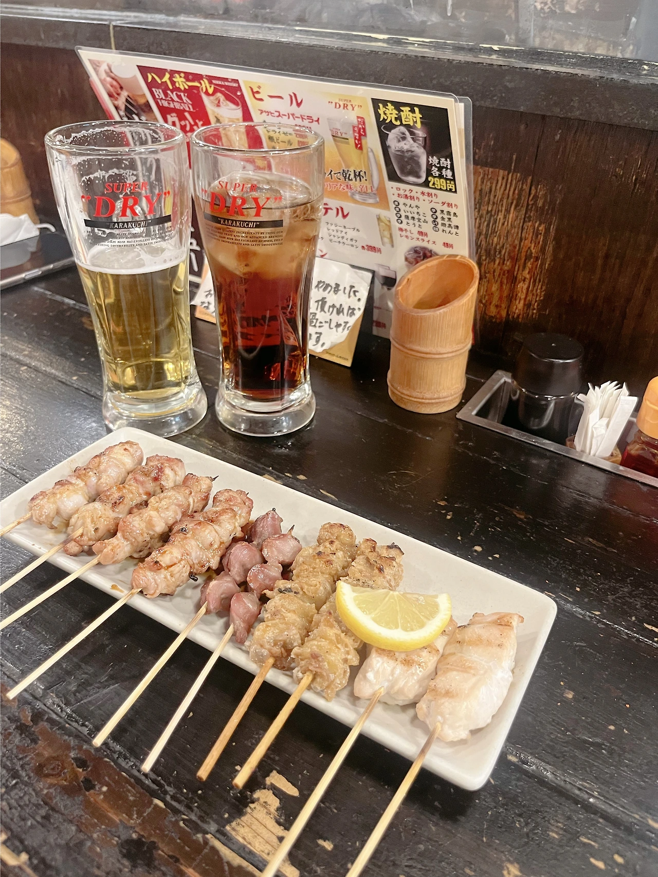 한국 관광객들이 많이 가는 우메다역 인근 나니와노유 온천으로 가기 전에 들른 야키토리 식당이다. 야키토리란 ‘야키(焼き, 굽다) 토리(鳥, 닭)’ 말 그대로 “닭고기를 구웠다 “라는 의미로 닭, 소, 내장 등을 꽂은 꼬치 요리들을 말한다. 당시 우리가 일본에 도착한 날은 1월 1일로 문을 연 식당이 많지 않았다. 그 덕분인지 아니면 원래 손님이 많은 가게였는지는 모르나 현지인들이 꽤 많이 식당에 있어 무작정 들어갔다. 씩씩하게 주문을 하려고 식당에 들어가자마자 아차 싶었다. 일어로만 이루어진 메뉴판을 보자마자 뭘 어떻게 주문해야 하나 싶은 마음에 안절부절못하던 찰나, 혹시나 하는 마음에 핸드폰으로 외국어 번역에 대해 이것저것 찾아보다 파파고 앱을 깔고 사진을 찍으면 사진에 나온 외국어를 번역해 주는 기능을 발견했다. 해당 기능을 통해 먹고 싶은 야키토리들을 주문했다. 먹을만했고, 입 맛에 맞는 것들은 꽤 맛있게 먹었다. 후에 주먹밥과 타코고추냉이를 추가 주문해 후식처럼 먹었다. 후에 구글 지도 평점을 보면 맛이 요리해 주는 사람에 따라 많이 바뀐다는 평이 있었다.