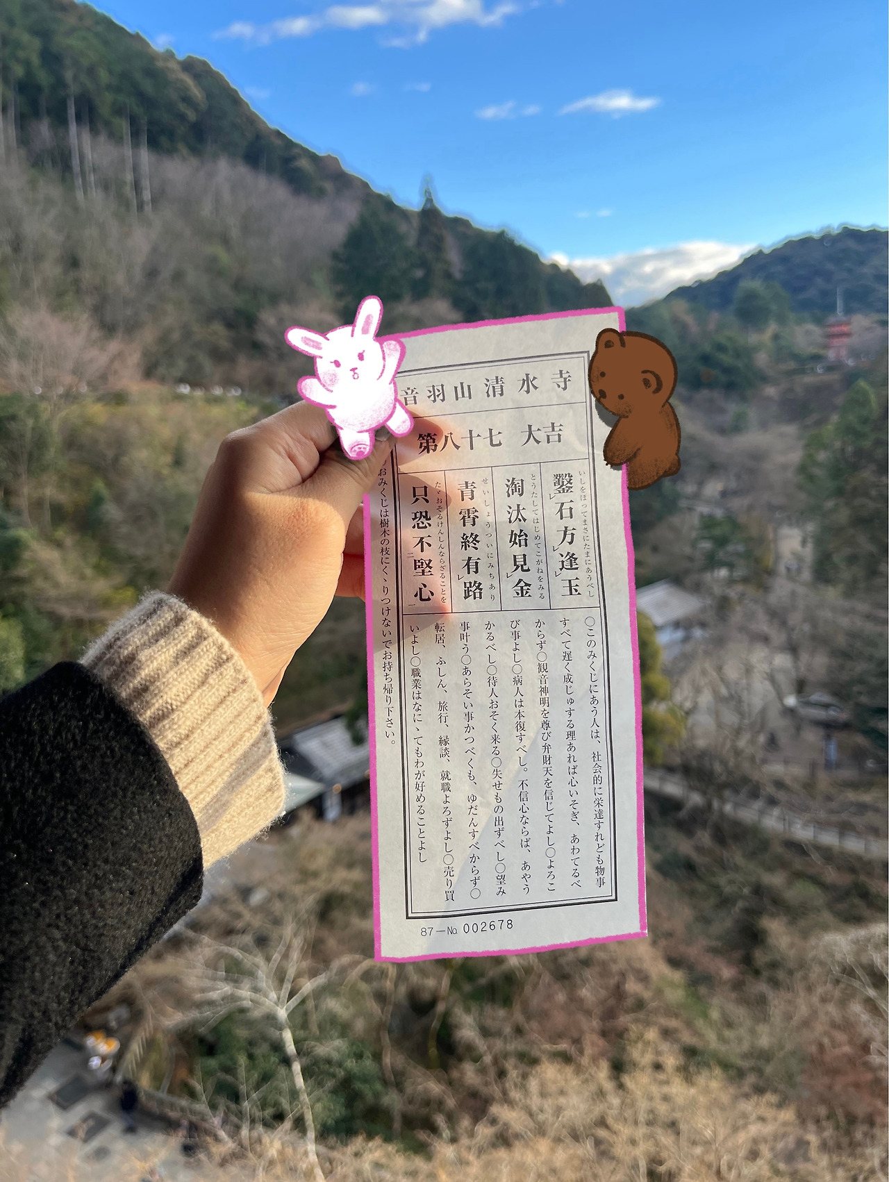 오사카의 도시 풍경도 무척 좋았지만, 여행 중 제일 좋았던 것은 교토였다. 일본의 옛스러움을 가지고 있는 교토는 나에게 흥미로움 그 자체였기 때문이다. 서구권 나라들과 비교했을 때 비교적 우리나라와 비슷한 재료와 건축방식을 사용하며 같은 동양권임에도 그 차이가 재밌었다. 검은색 목자재부터 이층으로 된 양식과 어딘가 아기자기한 감성의 집들이 옹기종이 모여있는 형태까지. 청수사를 향해 가는 내내 옛스러운 건물의 가게들과 집을 구경하느라 지루할 틈이 없었다. 그렇게 도착한 성수사는 붉은색의 건물들이 내 눈을 한번 더 사로잡았다. 우리나라에는 단청에 들어가는 오방색을 제외하고는 은은하고 우아한 색을 사용하는데 비해, 과거 일본의 선조들은 색 선택이 과감하다는 생각이 들었다. 입장권을 끊고 본당으로 들어가는데 길게 줄을 선 사람들의 행렬이 보였다. 호기심 어린 마음에 줄의 맨 앞을 가보니 신년운세 뽑기를 하는 것이 아닌가? 신이 난 나는 유니버설 스튜디오에서 2시간 30분 넘게 서 있었는데 이 정도 웨이팅은 별거 아니지란 마음에 일단 줄을 섰다. 15분 정도 줄을 서서 기다리니 금방 내 차례가 왔다. 나무로 만든 다각형 통을 흔든 후 통을 뒤집어서 나무막대기를 나오게 하면 되는 것이었다. 멀리서 다른 사람들이 하는 것을 보았을 때에는 나무통이 무척 무거워 보였다. 그런데 막상 들어보니 나무통은 꽤나 가벼웠고, 힘껏 뒤집어 한자로 팔십육이 쓰인 나무막대기를 뽑을 수 있었다. 그리고 앞에 계신 직원에게 보여드리니 86번 쪽지를 나에게 주셨다. 86번 쪽지는 굉장히 얇아 뒤가 은은하게 비춰 보이는 두께였다. 그리고 그 종이에는 한자로 ‘대길’이 쓰여있었다.