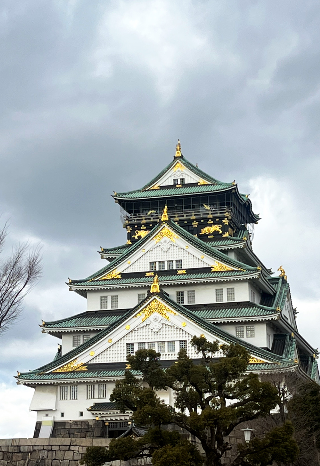 나에게 오사카성은 다소 진부한 관광지로 느껴졌다. 워낙 유명한 관광지고 오사카 관광 내내 맨홀 뚜껑에 오사카성 이미지가 디자인되어 있어 여행 내내 함께 하는 기분이 들었기 때문이다. 그럼에도 왠지 오사카에 갔으면 보고 와야만 할 것 같은 왠지 모를 의무감에 오사카성으로 향했다. 역 근처에서 내려 오사카 성까지 가는 길은 무지외반증 환자인 나에게 가는 길이 조금 길었는데, 날씨 좋은 날 오면 엄청 기분이 좋을 것 같다는 생각이 들었다. 하지만 애석하게도 우리가 방문한 날은 우리나라보다는 분명 따뜻했으나 겨울철 날씨답게 차가운 바람이 스산하게 스치는 시기였다. 내가 싫어하는 추위에 걷기까지 하니 절로 말 수가 없어질 때쯤 오사카 성 건물의 뒤편이 보이기 시작했다. 그 순간 나는 다른 의미로 말이 없어지기 시작했다. 꽤나 거대한 돌과 나무로 이루어진 성이 오묘한 푸른 청색과 금색으로 이루어져 서있는 성은 죽기 전에 봐야 하는 세계역사유적 중 하나라는 말이 오버가 아니라는 사실을 알게 됐다. 성의 정면으로 와보니 많은 인파들이 몰려있는 것이 보였고 다들 오사카성을 배경으로 인증샷 찍기에 한창이었다. 인플루언서가 되기 그른 나는 조용히 오사카성만 찍고 온 것만으로도 꽤나 큰 만족을 느낄 수 있었다.