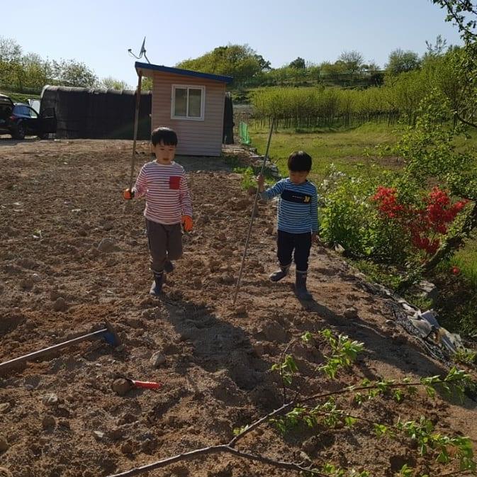그렇게 우리가 심었던 아기나무에서 새싹이 돋았다. 너무 귀여웠다. 힘내라고 둘째가 쉬야도 해줬다.첬째는 나무마다 이름을 지어주었다. 토니, 자비스, 페퍼, 피터... 모두 체리나무 복숭아나무들에게 지어준 이름들이다. 어느새 우리는 작은 주말농장 10억이에게 너무나도 익숙해져 가고 있었다. 마치 처음부터 그랬던 것처럼...