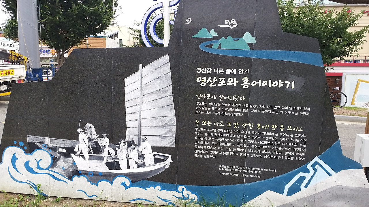 영산포에는 홍어거리가 있다. 여기에 홍어 맛의 탄생 비화가 있다. 흑산도에서 잡힌 홍어가 영산강을 따라 영산포까지 배에 실려 오는 도중에 홍어는 신선도를 잃고 숙성되어버렸다. 신선도를 잃은 생선은 속 빈 강정과 다름없을 테지만 이 과정에서 홍어 특유의 독특한 맛이 형성되었다.