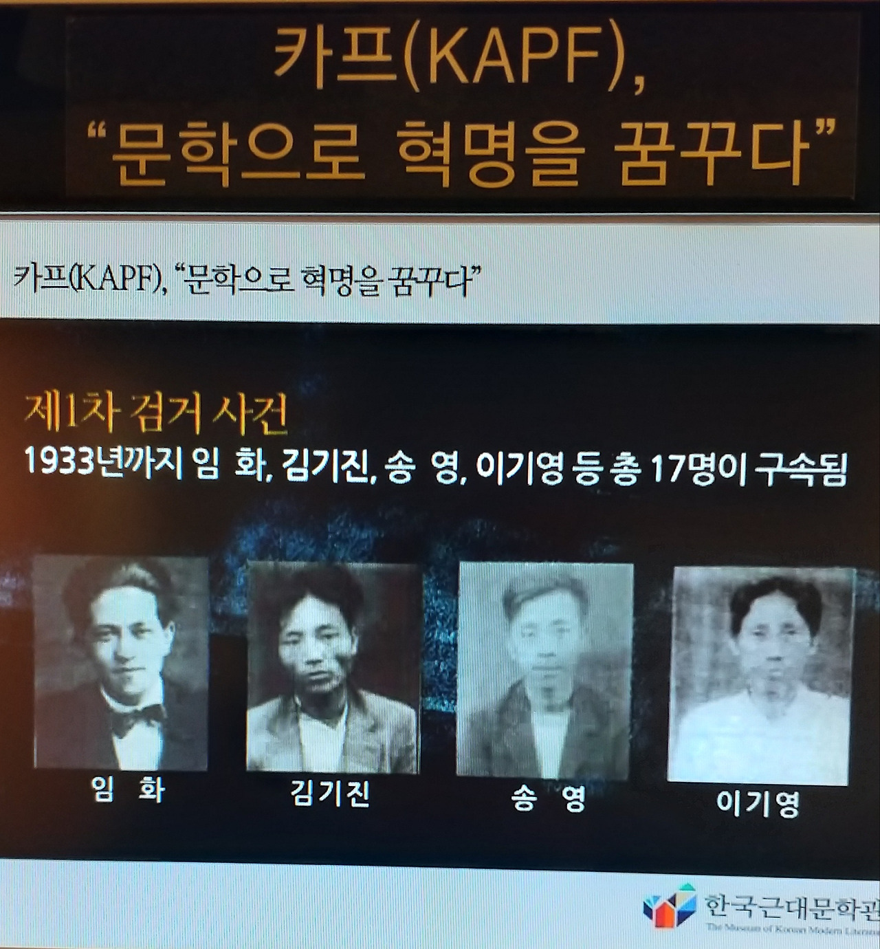 한편 진보적인 문학 단체도 역사에 등장한다. 카프(KAFA–조선프롤레타리아예술동맹)라는 이름으로 문학가 동맹이 태동했다. 이들은 문학이란 단순히 텍스트가 아니라 사회현실을 변화시키는 수단이어야 한다고 보았다. 근대 문학이 리얼리즘과 모더니즘을 만나 식민지 현실을 혁파하기를 꿈꾸었다. 1925년에 결성하여 1935년 해산되기까지 카프운동은 문학을 통해 식민지 현실을 직시하고 조선 독립과 혁명을 꿈꾸었다. 이들의 작품에는 부조리한 식민지 체제에 저항하는 노동자와 농민들을 주체로 강조했다. 문학의 역할에 대한 다양한 논쟁이 전개되면서 리얼리즘 문학은 한층 첨예해졌다.