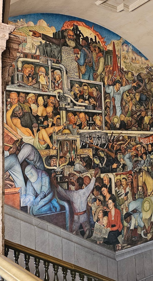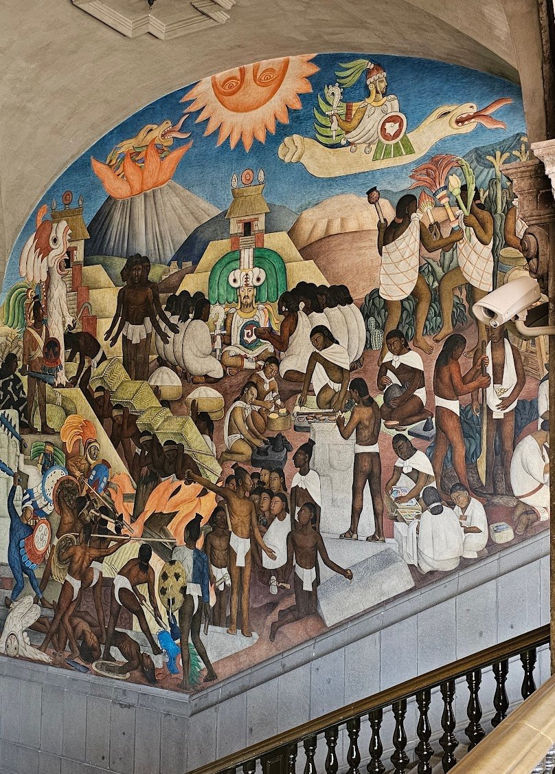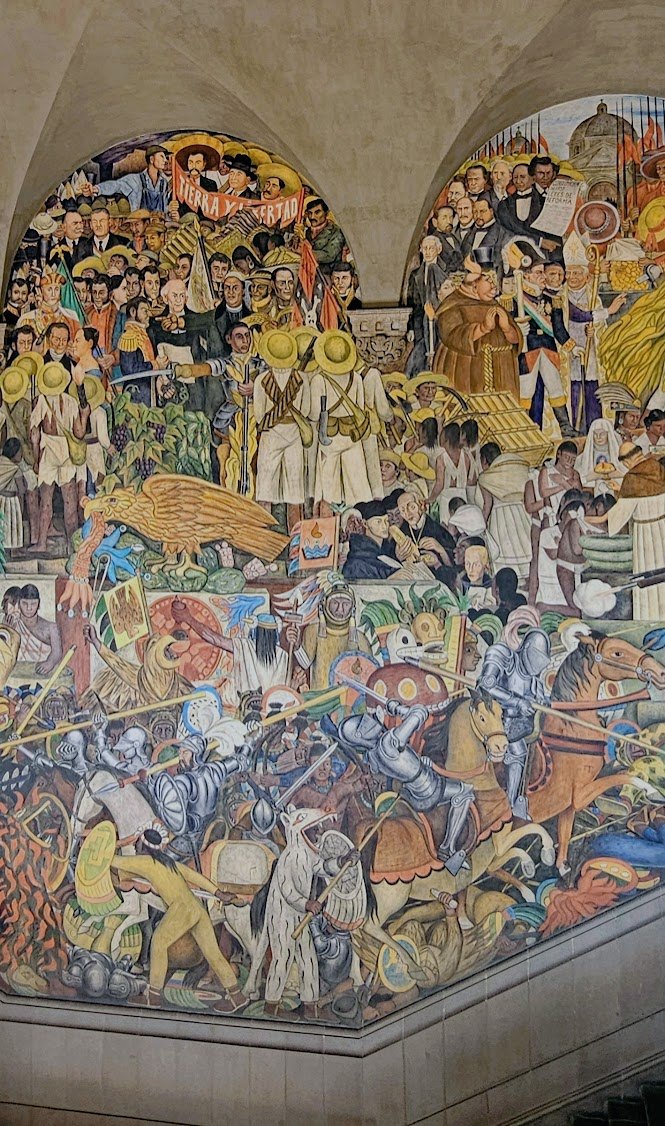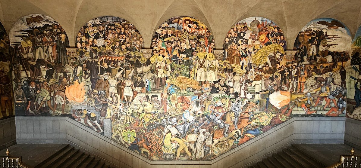 디에고 리베라의 역사 벽화는 대통령궁 실내 계단을 올라가는 계단면 정면과 좌우 측면에 그려져 있다. 놀랍게도 벽화에는 멕시코의 멕시코의 큰 역사 줄기가 고스란히 담겨있다. 한 편의 압축된 멕시코의 장엄한 역사 서사이다.