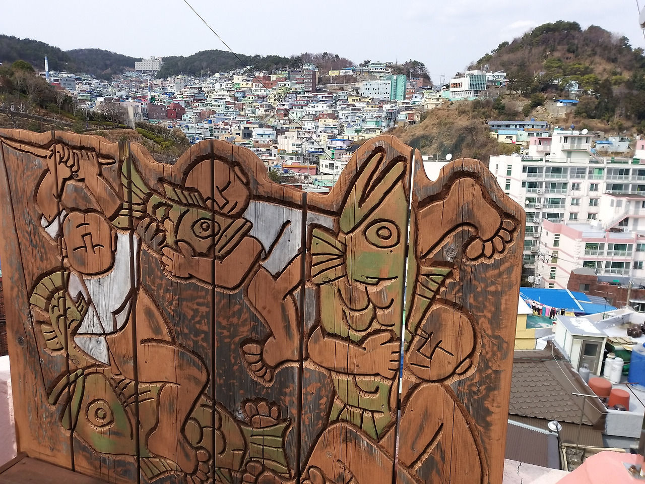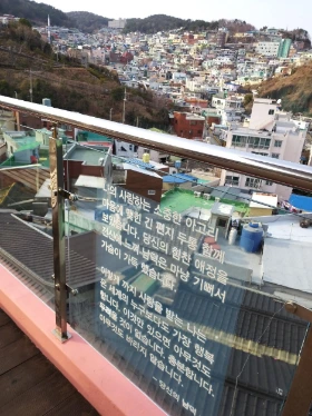 범일동 산마을의 기슭에 설치된 이중섭 전망대 난간 유리벽에는 두 사람 부부간의 애틋한 사랑을 확인할 수 있는 편지 글이 새겨져 있다.
