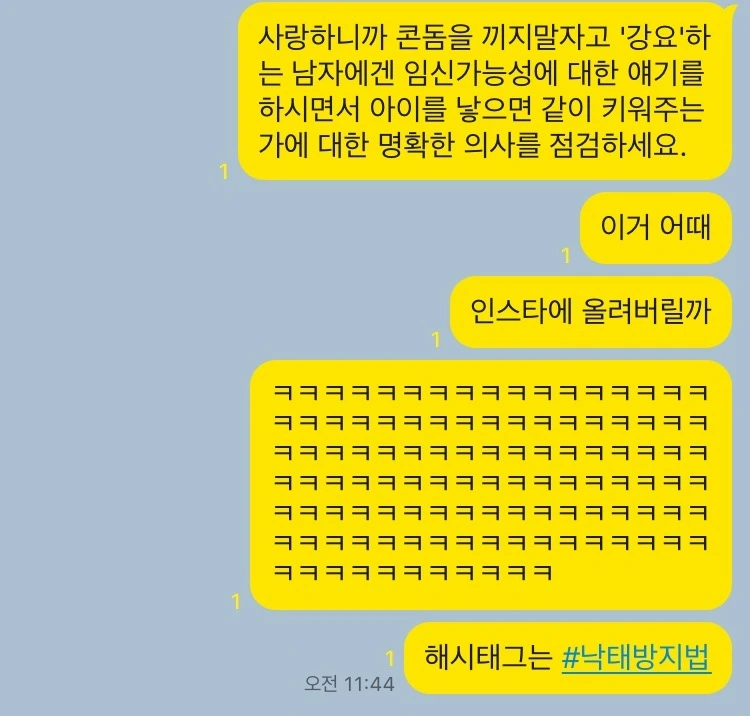 “사랑하니까 콘돔을 끼지 말자고 ‘강요’하는 남자에겐 임신 가능성에 대한 얘기를 하시면서 아이를 낳으면 같이 키워주는가에 대한 명확한 의사를 점검하세요. 강요가 아니라면 제가 알 바는 아닙니다. 사랑하세요~”