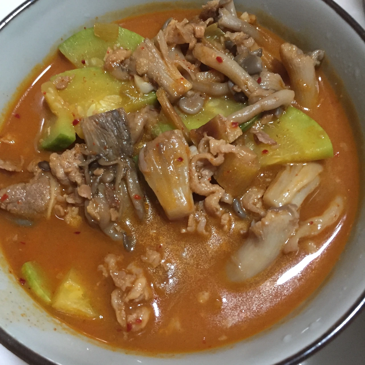 오늘은 내가 차돌된장찌개를 끓여보았다. 내가 제일 좋아하는 찌개를 꼽으라면 단연 차돌된장찌개! 차돌박이 인지는 모르겠지만 아무튼 얇은 소고기를 냄비에 넣고 들들 볶는다. 어느새 기름이 새어 나온 고기는 팬에 구울 때보다는 촉촉함을 머금고 있다. 촉촉하게 볶아진 고기에 물을 붓는다. 여기에 얇게 채 썬 무를 넣으면 맛이 더 좋다고는 하나, 무가 없으니 패스! 쌀뜨물이나 육수가 더 좋다고는 하나, 미리 만들어놓지 못했으니 패스! 그냥 생수를 넣어 끓이기 시작한다. 없는 재료를 뛰어넘어가는 것도 집밥만의 매력이지 않을까. 보글보글 끓어가는 고기 국물에 된장과 고추장, 후추를 적당히 넣어준 후 틈틈이 맛을 본다. 맛있다 싶은 정도면 충분하다. 나의 비율은 된장:고추장, 2:1의 비율이다. 그 정도면 딱 좋더라. 이때쯤에는 찌개라고 하기에는 약간 싱거운 것 같아도 괜찮다. 끓이다 보면 짜지기 마련이다. 그렇게 간을 맞춘 뒤에는 애호박, 두부, 대파, 버섯 등을 송송 썰어내어 국물에 투하! 배부르고 든든하게 먹고 싶을 때에는 국물의 양에 비해 과하다 싶을 정도로 재료를 넣어줘도 괜찮다. 오늘은 과하게 먹고 싶은 날이니 국물에 가득 차게 재료들을 넣었다. 아참, 두부가 없어서 두부는 또 패스! 마지막으로는 고춧가루를 적당히 뿌려준다. 두부가 없어도 맛있기만 한 차돌된장찌개 완성이요!