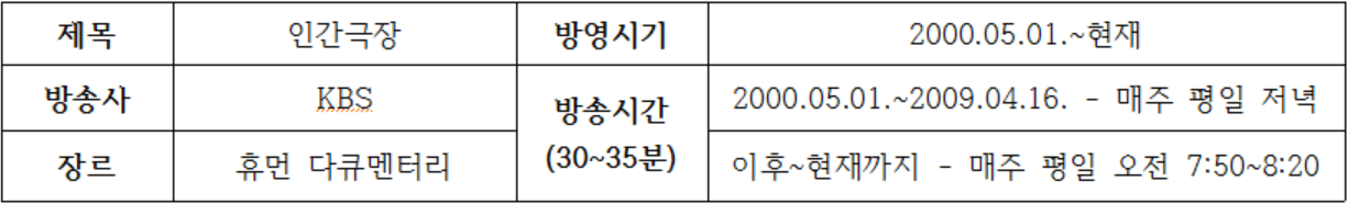 -출처 : 강용두, 「TV휴먼다큐멘터리 프로그램의 생산과 문화와 제작 요소에 대한 연구-KBS <인간극장>을 중심으로-」