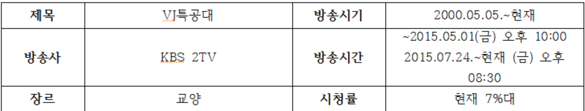 최종을(KBS 'VJ특공대‘ CP), <VJ특공대 제작사례 연구>, 한국방송학회 학술대회 논문집, 2001