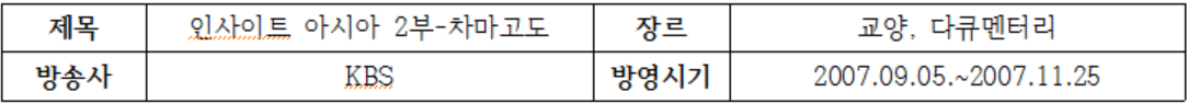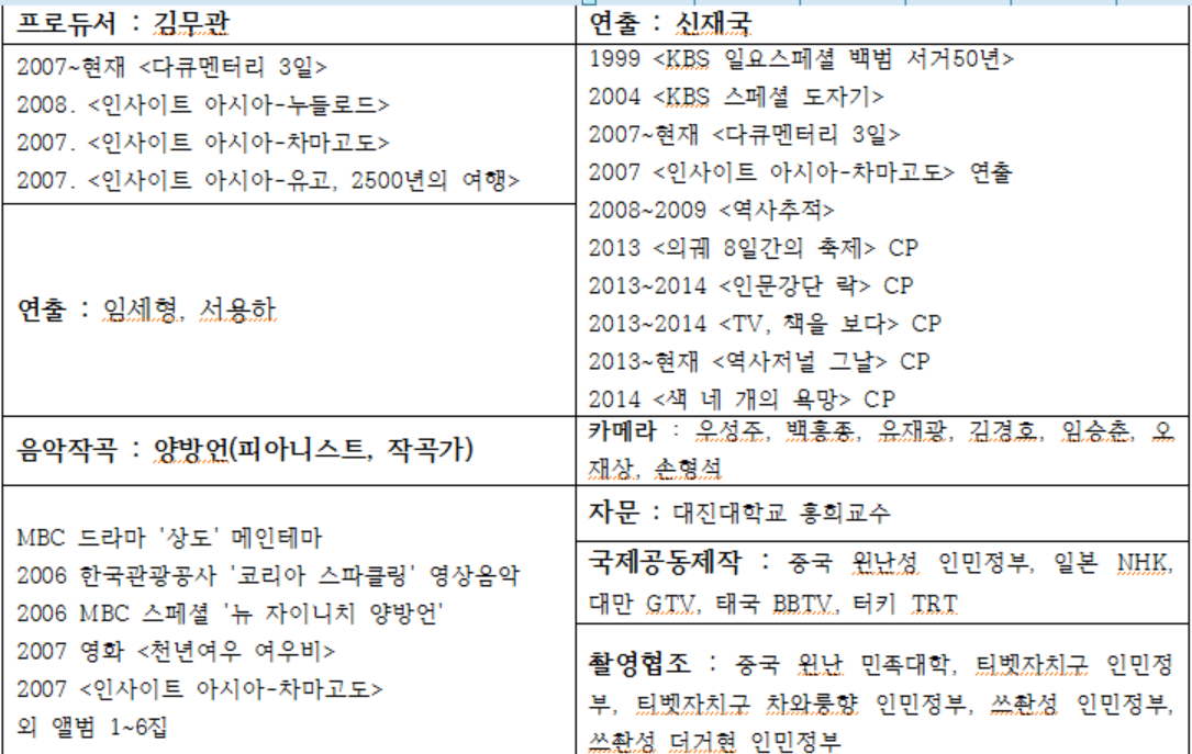 -이상요, 「한국 TV 다큐멘터리의 세계화 전략에 관한 사례 연구_KBS 다큐멘터리 <차마고도>를 중심으로」, 2011