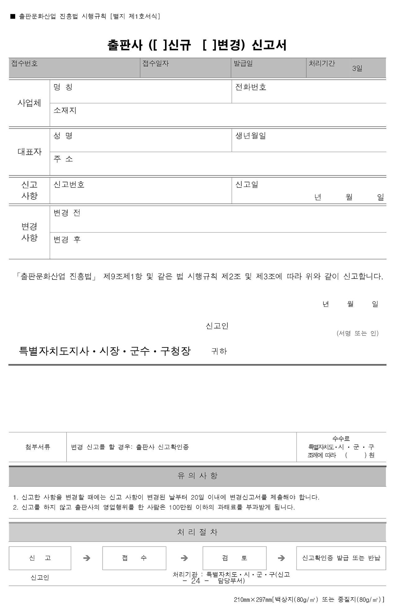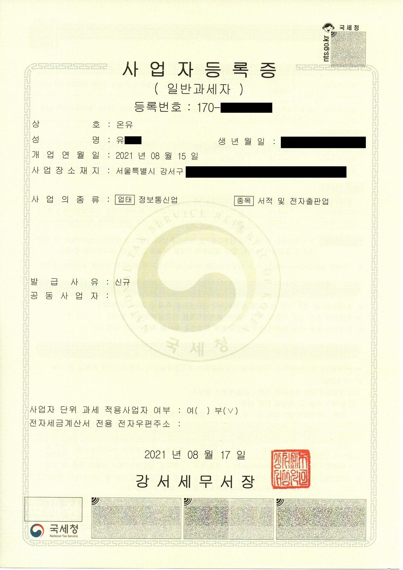 작성 시 요령은 사업 현황에서 주업태는 '정보통신업', 주업종은 '서적 및 전자출판업'을 적으시면 됩니다. 출판업은 부가가치세 면세사업자이나, 굿즈 등을 함께 판매할 경우 일반과세자나 간이과세자로 등록하셔야 합니다. 처리 기간은 2일 이내로, 저 같은 경우 그 자리에서 바로 처리되었고 비용은 무료입니다.