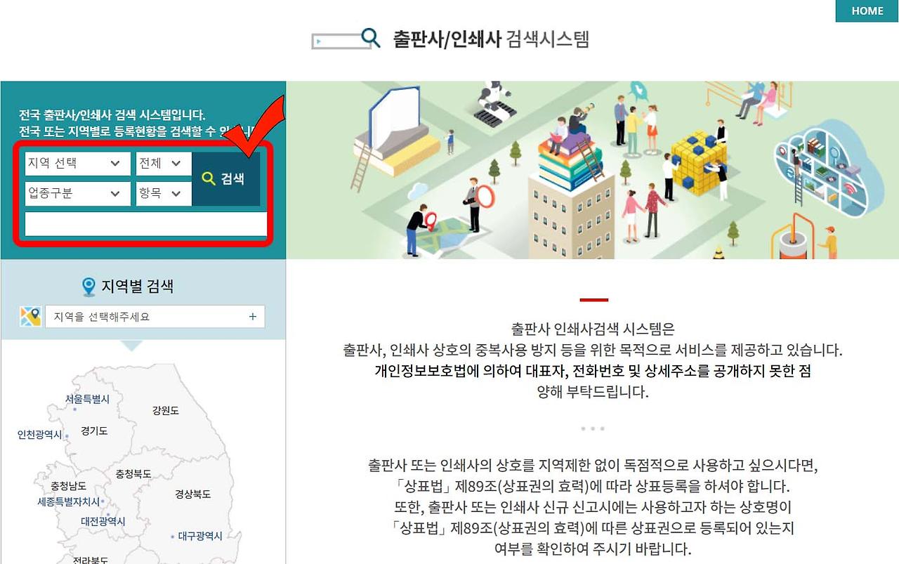 예를 들어, '온유'라는 이름의 출판사를 만든다고 했을 때, 검색 창에 지역선택(서울특별시), 업종구분(출판사), 전체(영업), 항목(상호)로 설정해 놓고 아래 빈칸에 '온유'이라고 쓴 다음 검색 버튼을 누르면 해당 내용을 확인할 수 있습니다.