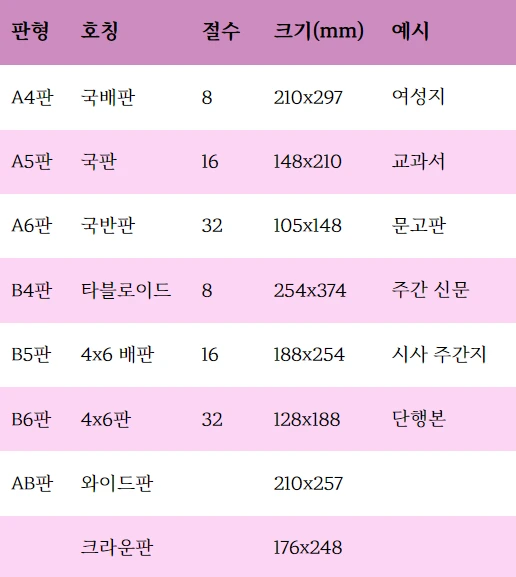 우리나라에서 가장 보편적인 판형을 A5신판이라고 하는데, 이는 정규적인 A5판(148x210mm)보다 약간씩 큰 152x225mm의 크기이며, 신국판이라고도 합니다.