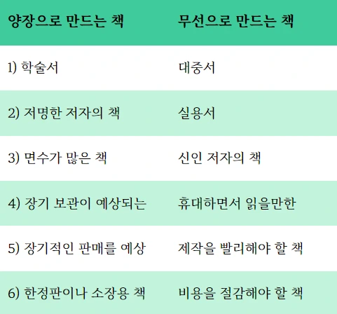 책의 형태는 제본 방식에 따라 크게 2가지로 양장, 무선으로 분류할 수 있습니다.