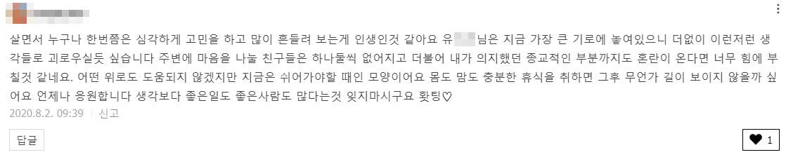 끝으로 멋진 댓글을 달아주신 두 분의 은혜도 잊지 않겠습니다. 그리고 저 또한 어려움에 처해있는 누군가가 있다면 그들을 위로하고 격려하는 선한 존재로 살아가겠습니다. 저의 이 고백이 사람들의 영혼을 살리는 노래가 되어 이 세상이 좀 더 풍요로워지고 더욱 밝아지기를 간절히 소망합니다.