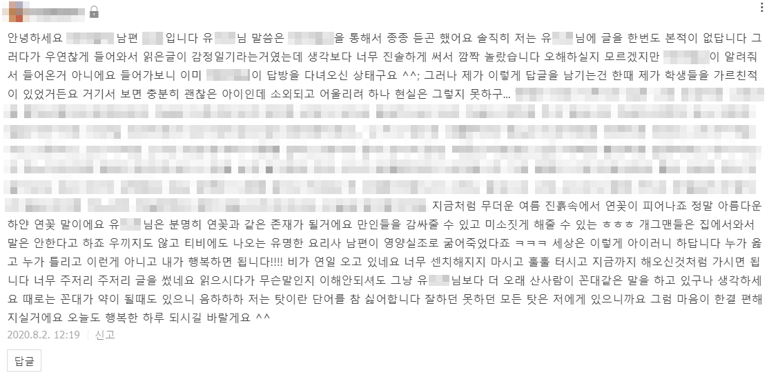 알고 보니 위 글의 주인공은 소통 이웃님의 남편 분이셨고 두 분이 동일한 아이디로 블로그를 함께 운영하고 계셨습니다. 그런데 우연찮게 저의 글을 보시게 되면서 많이 안타까우셨었는지, 편지 2~3장의 분량이 되는 장문의 글을 남겨주셨더라고요. 사실 첫 댓글만으로도 너무 감사드렸는데, 두 번째 댓글을 예상치 못했던 남편분에게서 받게 되어 새삼 놀래기도 했고 어디선가 갑자기 찾아온 따뜻한 선물처럼 느껴졌습니다.