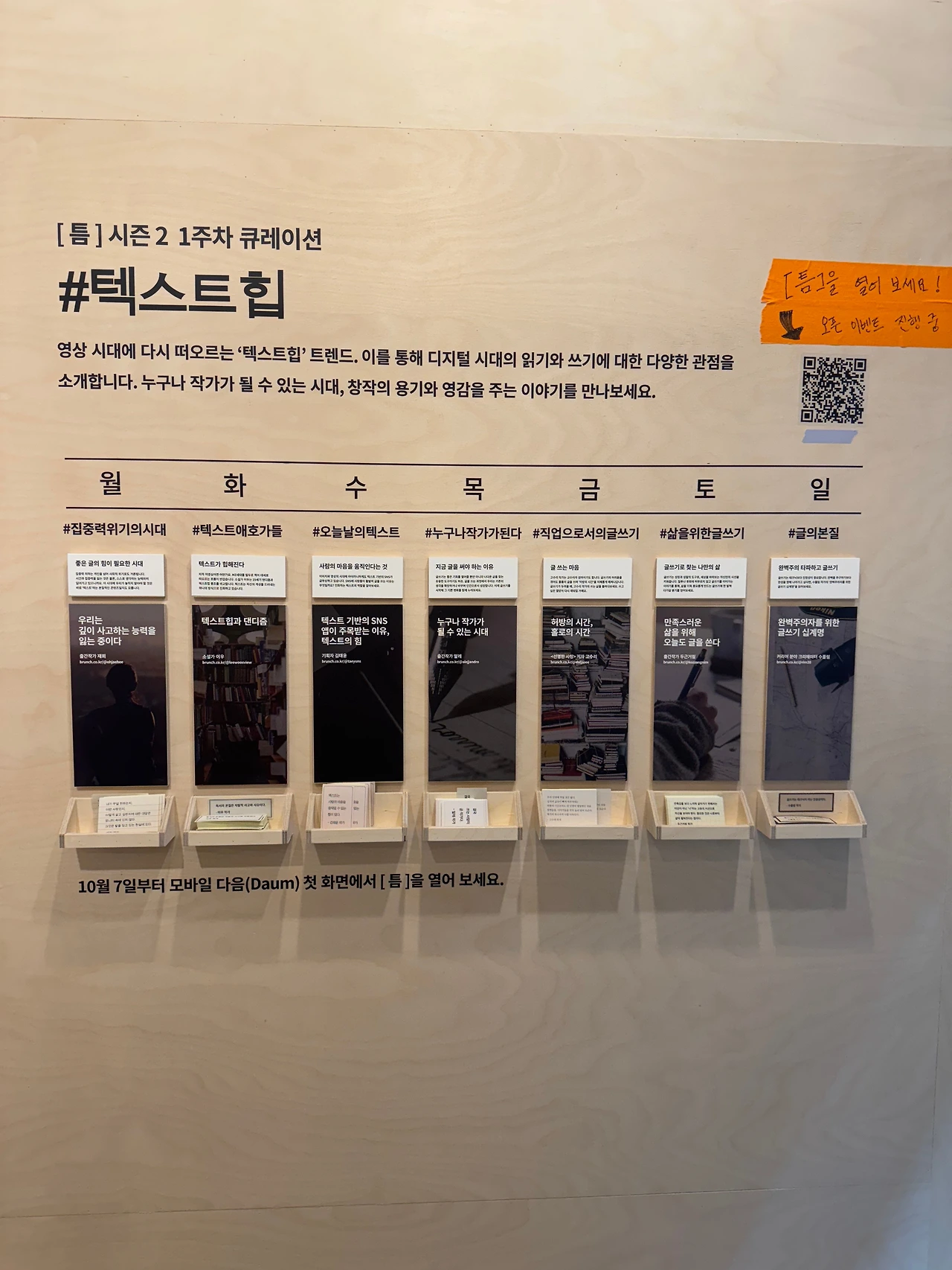 초가을 아직은 여름의 냄새가 조금 더 느껴지는 따듯한 날이다. 작가가 되고 싶어 하는 지인의 소개로 이 전시를 만나게 되었다. 지인의 한 면을 엿보았고, 관심 있어 찾은 많은 이들의 진지한 얼굴을 만났다. 그러다 이 느낌을 소개해 주고 싶은 또 다른 지인이 생각나 전시의 마지막 날 한번 더 방문하였다. 따듯하고 편안하고 또 슬프고 진지하고 치열하고 설레고 두려워하고.... 정말 많은 감정들이 담겨 있었다. 팝업이 예약을 통해 오는 곳이라 아무래도 2,30대가 많았는데, 그 속에 60대 할머니 한 분은 단연 눈에 띄었다. 실상 나만 그분을 이방인으로 보고 있었을 뿐, 온전히 진지하게 집중하고 있는 눈빛은 별생각 없이 따라나선 나보다 훨씬 그 속에 짙게 녹아있었다. 글쓰기에 관심이 있는 사람이 그 무거움을 내려놓고 도전하고 싶다는 마음이 드는 편안하고 구체적인 구성이었다. 이미 작가로 출간하신 분들이 어떻게 글쓰기에 접근하였는지를 소개해 주고, 키워드를 3가지 정도 정하여 그들이 어떻게 활용하였는지를 가시적으로 보여주었다. 마인드맵을 활용하거나, 매일의 주제를 과제처럼 정해주면서 글쓰기 스킬이나 방향을 제시해 준다. 다른 사람들의 책 제목을 보면서 그것만으로도 그들의 마음을 조금은 짐작할 수 있었다.