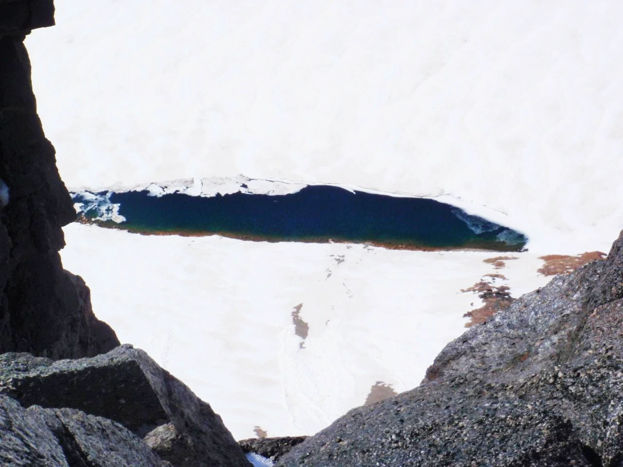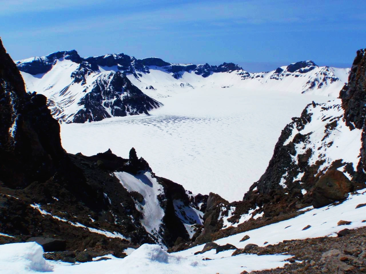 드디어 천지에 이르렀다. 비록 상상했던 푸른빛의 드넓은 천지는 눈 속으로 모습을 감추었지만, 그보다 몇 배는 파랄 것 같은 청정한 하늘 아래 눈 덮인 천지의 모습도 충분히 감동이었다. 마치 저 눈들이 원래의 천지 색이라도 되는 것 같은 착각 속에서 한참을 서 있는데, 아래쪽에서 눈이 녹아내린 천지의 일부를 발견했다.