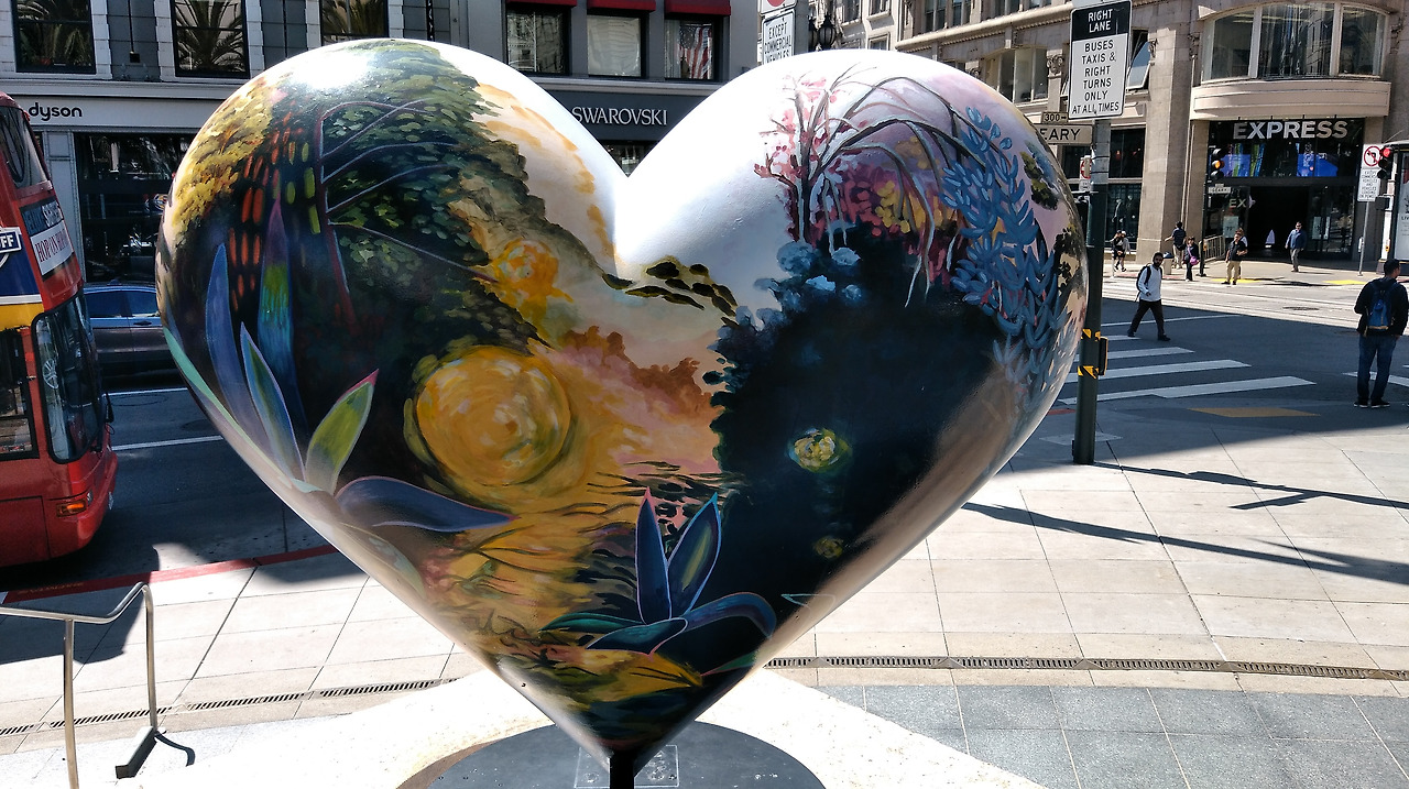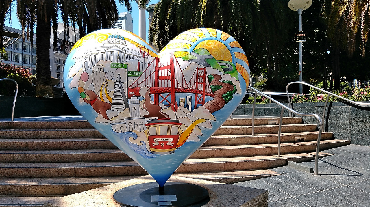 이토록 비장한 역사를 위로하기라도 하듯 광장의 네 모퉁이에는 로맨틱한 하트가 세워져 있었는데, 이 아기자기한 조형물은 Tony Bennett의 끈적끈적한 재즈곡 'I left my heart in San Francisco'에서 영감을 받아 제작된 것이라고 한다. 사실 스콧 맥켄지의 '샌프란시스코'가 워낙 유명하다 보니 그런 밝고 화사한 노래가 더 잘 어울릴 줄 알았더니 토니 베넷의 한없이 늘어지는 재즈곡도 의외로 어울린다는 생각이 든다.