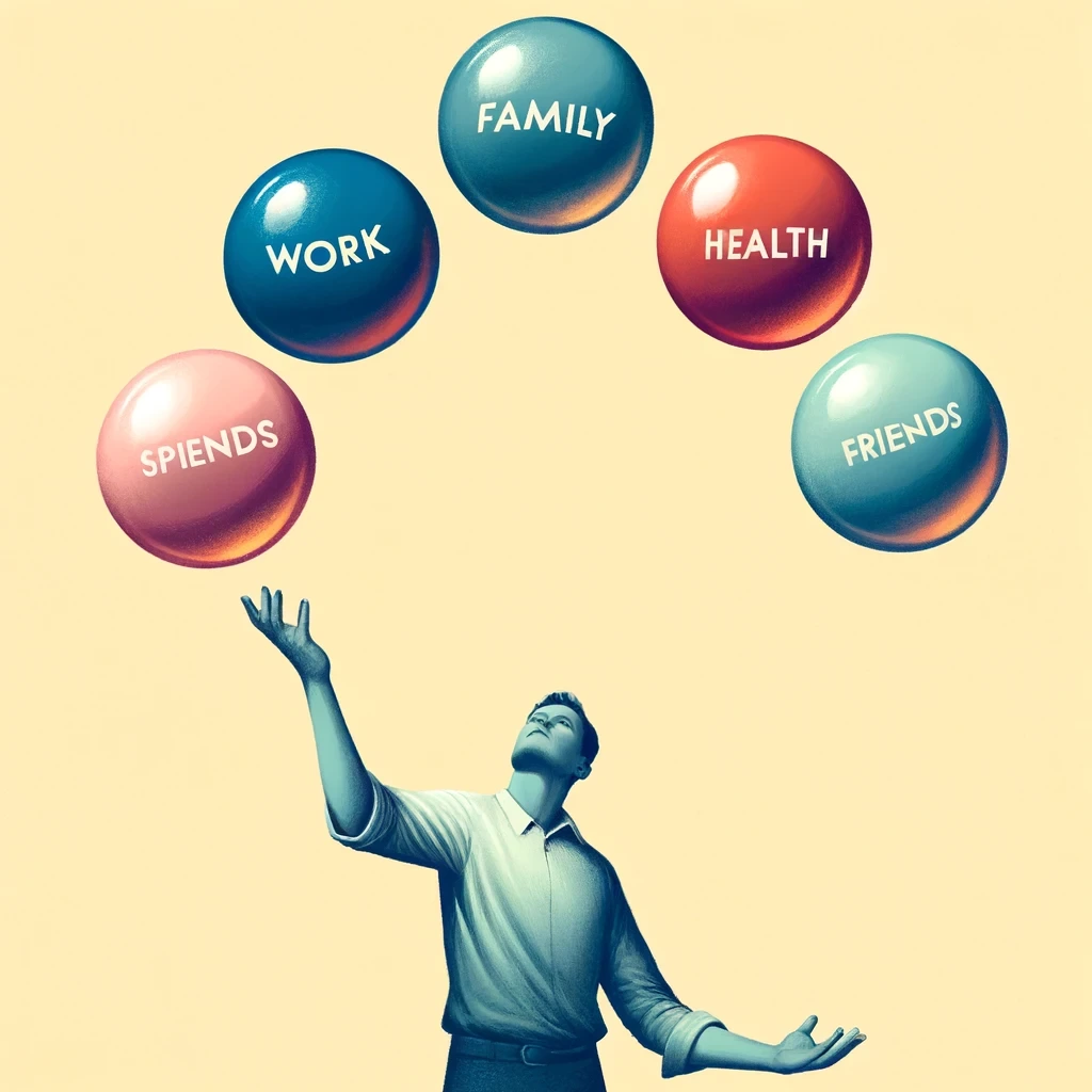 간단히 요약하면 인생을 공중에서 다섯 개의 공으로 저글링을 하는 게임이라고 생각해 보자. 일 가족 건강 친구 정신 이 다섯 개의 공이 공중에서 유지하고 있는데 일은 고무공이라 떨어뜨려도 금방 튀어 오르지만 나머지 볼은 유리로 만들어져 있어 한 번 떨어지면 흠집이 생기거나 손상 또는 산산조각이 날 수도 있다. 그런 메커니즘을 이해하고 삶의 균형을 위해 노력을 해야 한다는 내용이다.