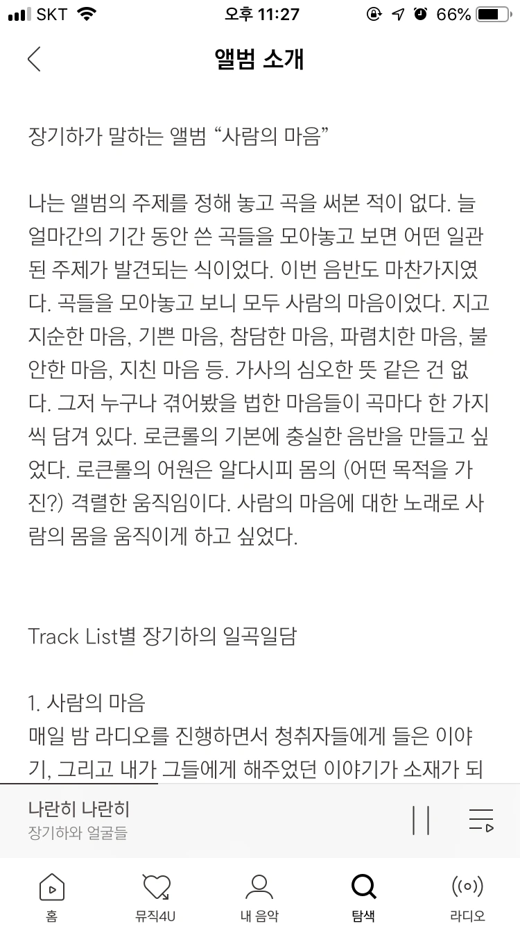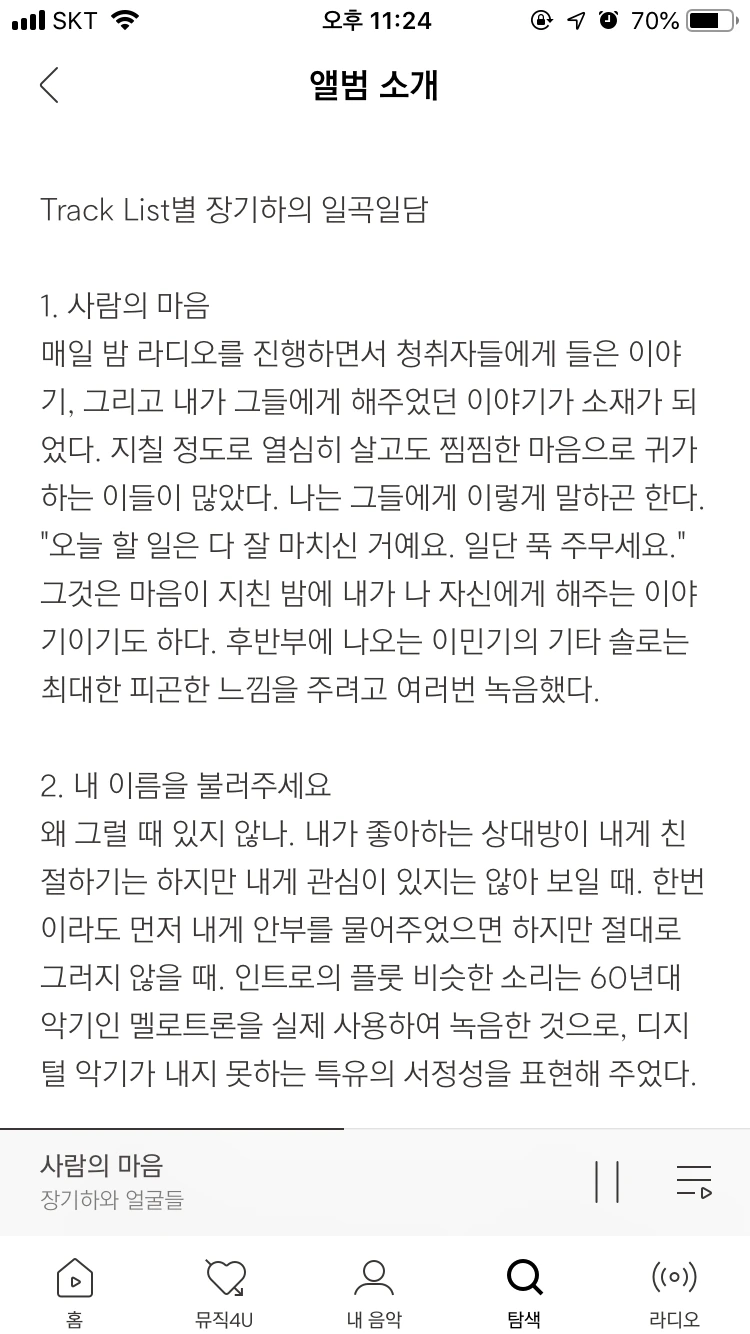 어떻게 이런 노래를 만들었을까? 어떻게 이런 가사를 썼지? 어떻게 이런 생각을 했지? 궁금할 때쯤 나는 앨범 소개글을 열어본다. 특히 가사를 직접 쓰는 아티스트의 노래를 들어보는 것이 좋다. 그들은 종종 앨범 소개에 직접 글을 쓰는데 아주 담백하고 민낯 느낌의 깨끗한 글들이 많다. 그걸 읽다 보면 꽤 재밌고, 가수들의 창조법(?)을 엿볼 수도 있다. (그래서 나는 가사를 직접 쓰는 가수를 더 좋아한다)