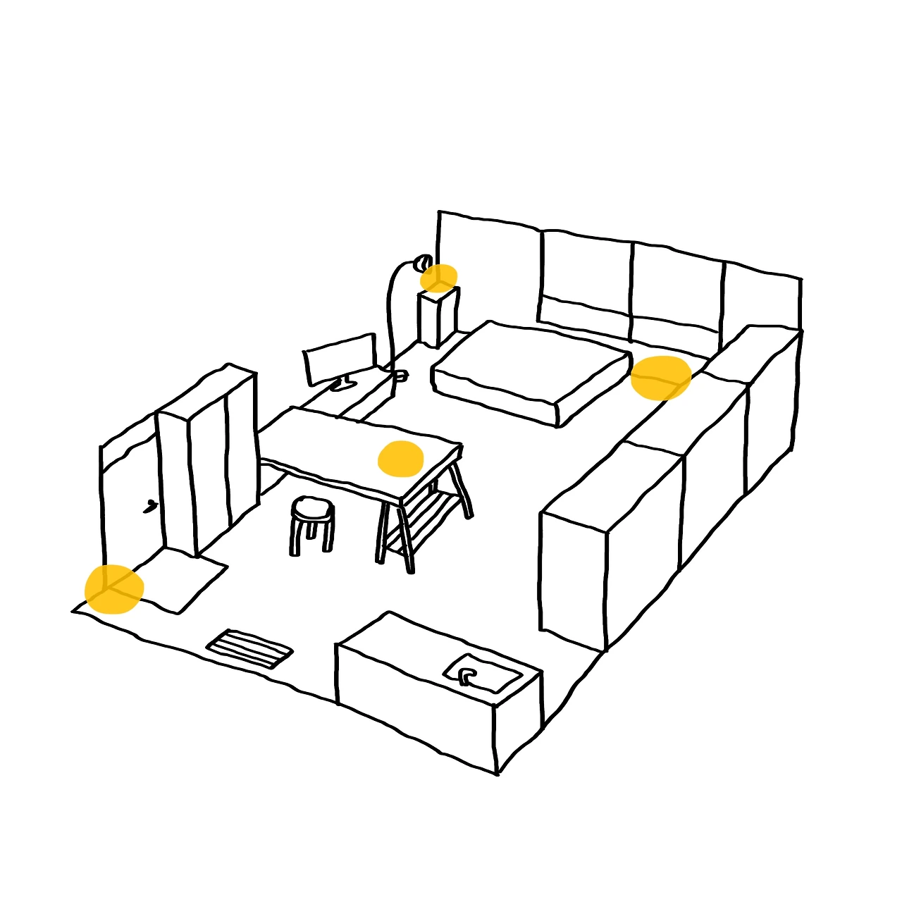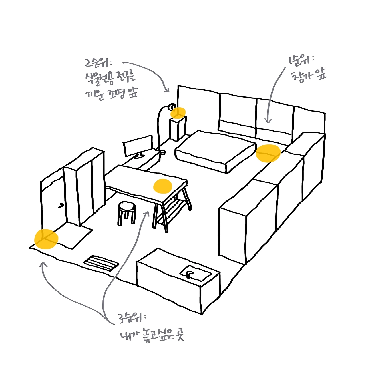 햇빛이 어디까지 들어오나? 확인하고, 놓고 싶은 자리의 순위를 매겨본다(좋은 환경 순서로)