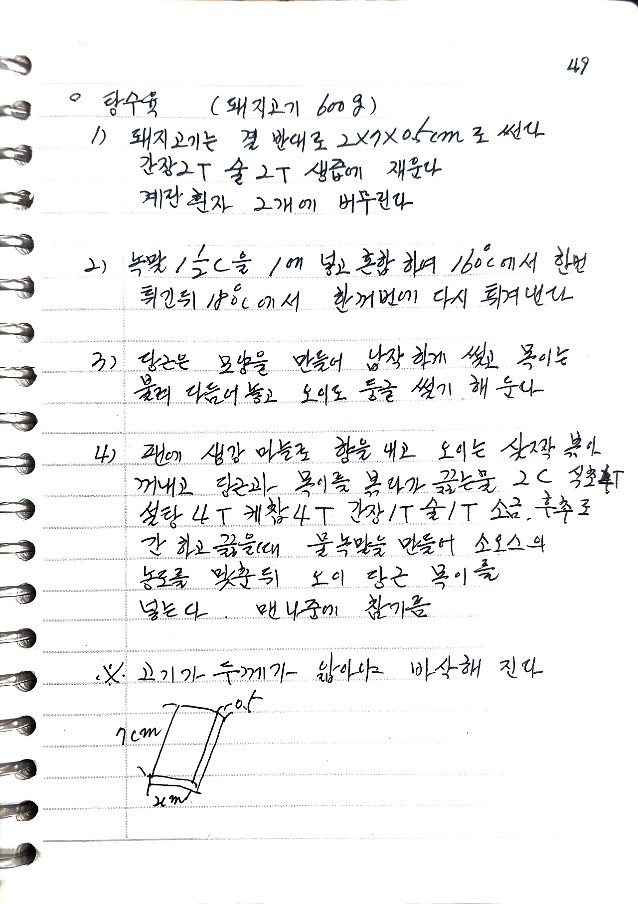 1) 돼지고기는 결 반대로 2*7*0.5cm로 썬다.