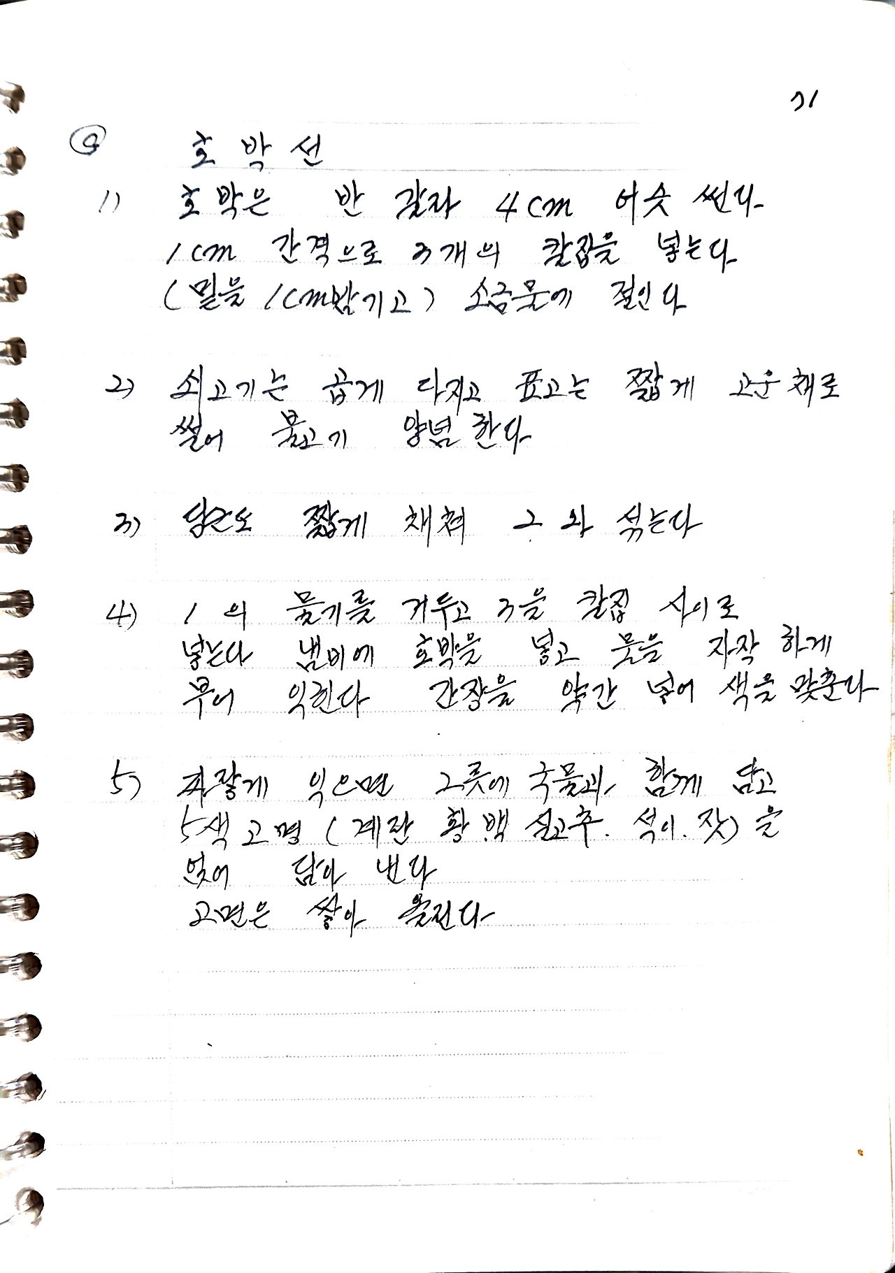 1) 호박은 반 갈라 4cm 어슷 썬다.