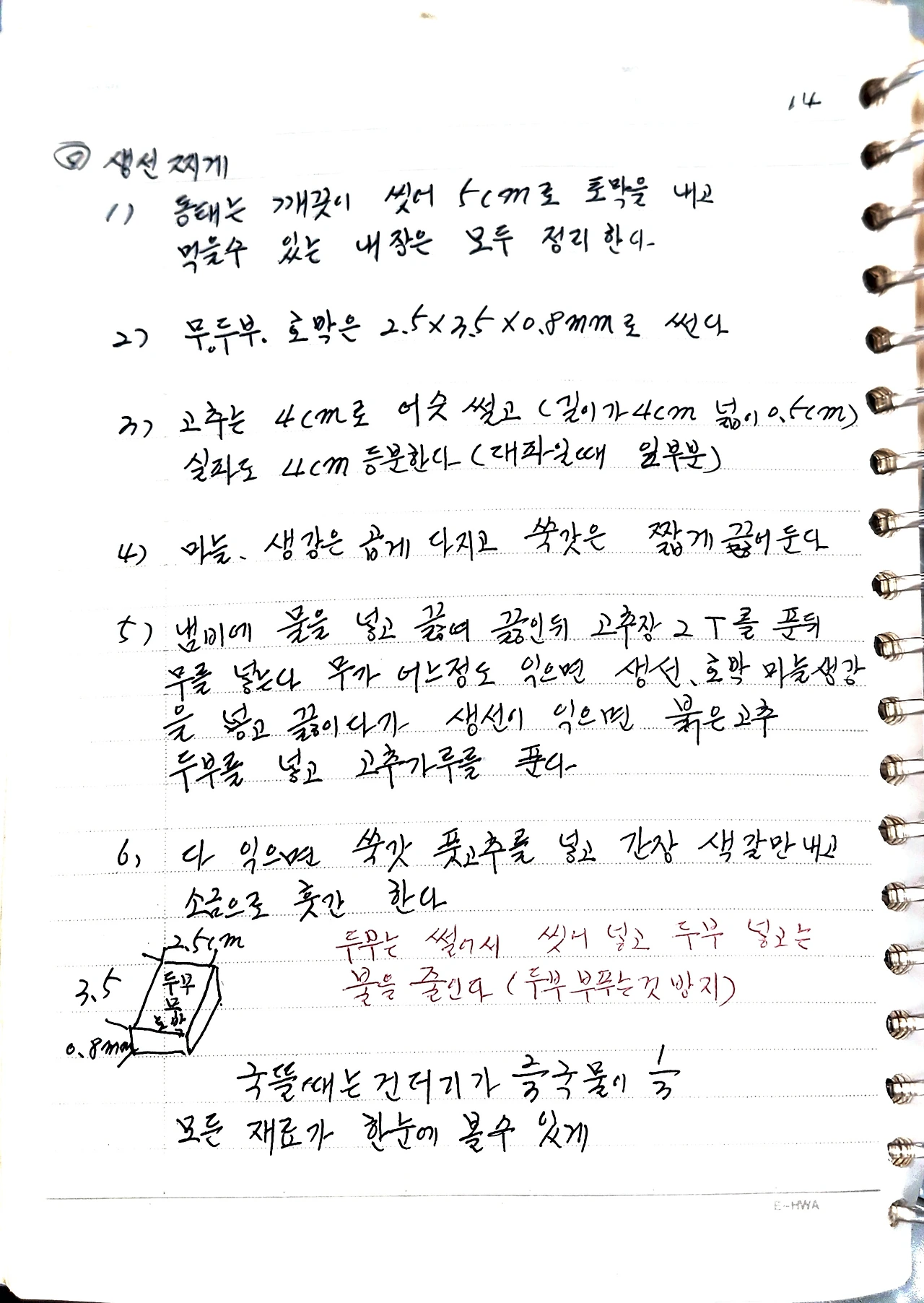 3) 고추는 4cm로 어슷 썰고 (길이가 4cm, 넓이 0.5cm)