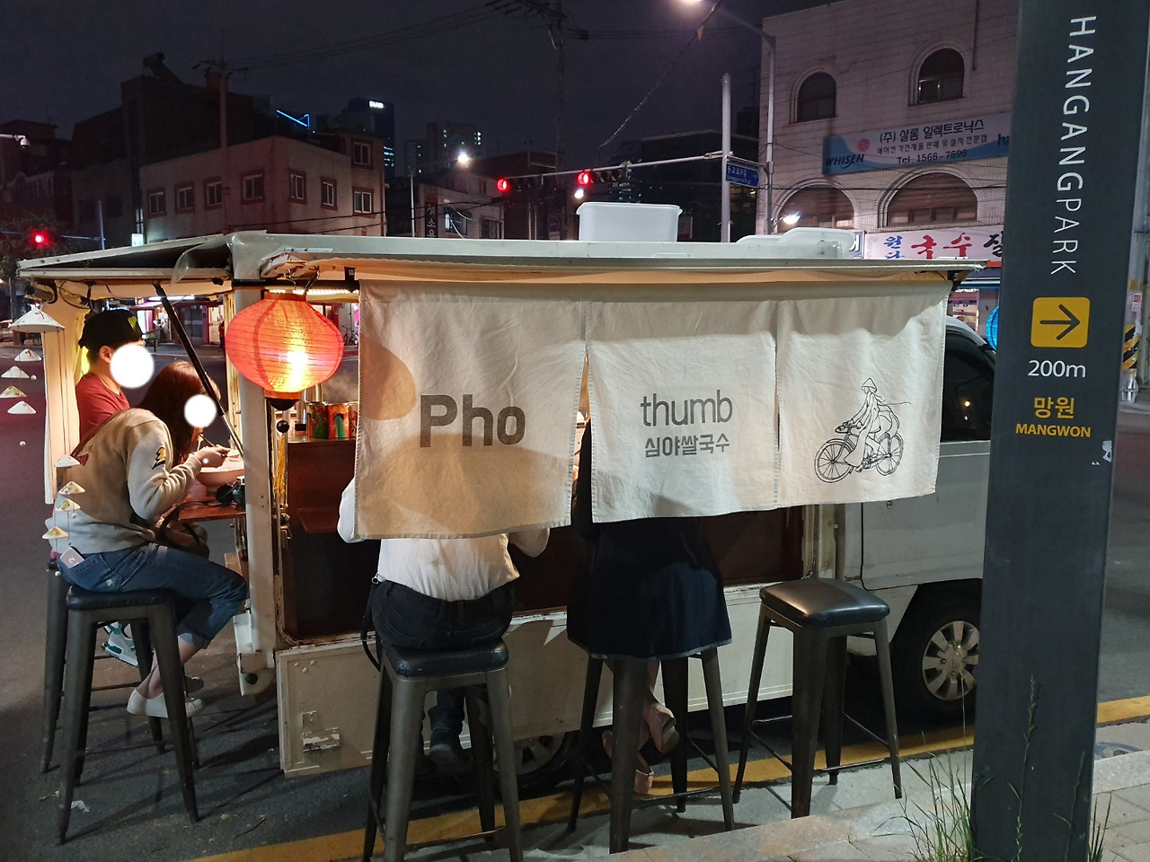 이곳엔 일주일에 한 번씩 쌀국수 트럭이 온다. 자리는 6개뿐. 밤 9시부터 이튿날 새벽 1시까지 영업하는데 재료가 떨어지면 그마저도 일찍 문을 닫는다. 카드는 안 받는다. 젊은 사장님이 합정과 망원, 상수 일대를 돌며 장사를 하는데 영업개시 전 인스타그램에 오늘은 어디로 갈지를 공지한다.