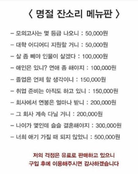 너무 전형적이어서 눈 뜨고 당했다. 30초 남짓한 대화에 '명절 어택 4요소(남친, 결혼, 애, 나이)'가 절묘하게 다 들어갔다. “우리 친척들은 모이면 전혀 취업, 결혼 압박이 없어”라고 말하며 살짝 우쭐했던 과거의 내 입을 꿰매버리고 싶다. 그저 내 차례가 되지 않아서였을 뿐, 그리고 내 위의 언니, 오빠들은 때에 맞춰 인생의 과업들을 달성했기 때문이었을 뿐이었다.