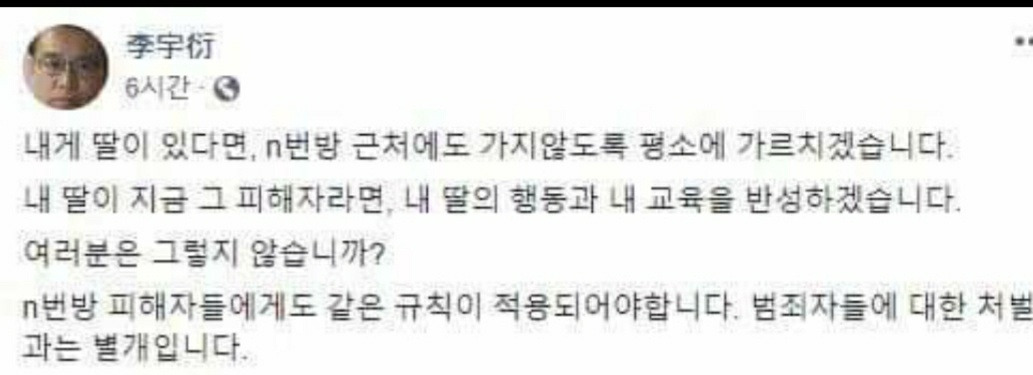 위선 때문에 더 역겹게 보일 뿐 사실 이런 인식은 사회 전방위적이다. “청소년이나 자라나는 사람들은 자기 컴퓨터에서 그런 짓 자주 한다”는 김오수 (무려!!!) 법무부 차관, “내게 딸이 있다면 n번방 근처에도 가지 않도록 평소에 가르치겠다”는 이우연 <반일종족주의> 공저자, 그리고 그를 비판하며 “네 딸이 당해봐라”는 평범한 가부장들. 과연 이들은 그들이 말하는 악마의 반대편에 선 것이 맞는가?