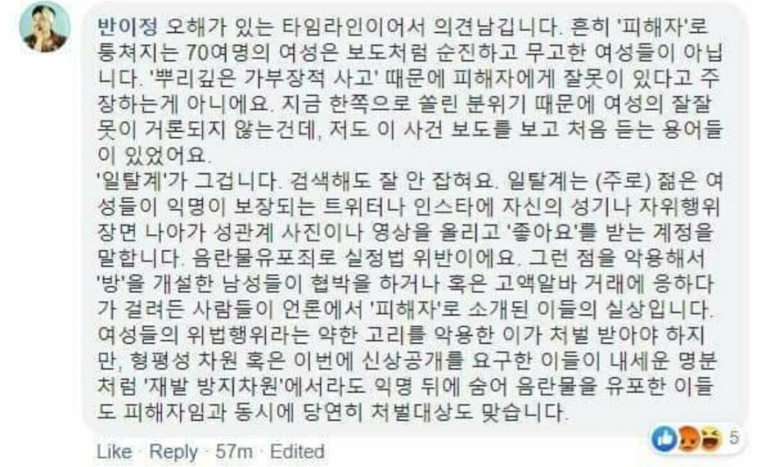 동시에 나는 반쪽짜리 인권을 주장하는 이들을 알고 있다. 진보 성향의 반이정 미술평론가는 페이스북 댓글에서 “흔히 ‘피해자’로 퉁쳐지는 70여명의 여성은 보도처럼 순진하고 무고한 여성들이 아니다”고 주장했다(순진무구한 피해자라는 허상, 왜 못 잃는가). 그는 앞서 2012년 박근혜 전 대통령의 출산 장면을 그린 홍성담 화백의 여성혐오를 지적하는 목소리에 대해 “여성 비하는 과잉해석”이라고 주장한 바 있다. (당시 우리 사회는 이를 논쟁거리로 보고 그에게 목소리를 낼 신문 지면을 할애해줬다) 나는 이제 진보를 말하는 남성들의 입을 믿지 않는다.